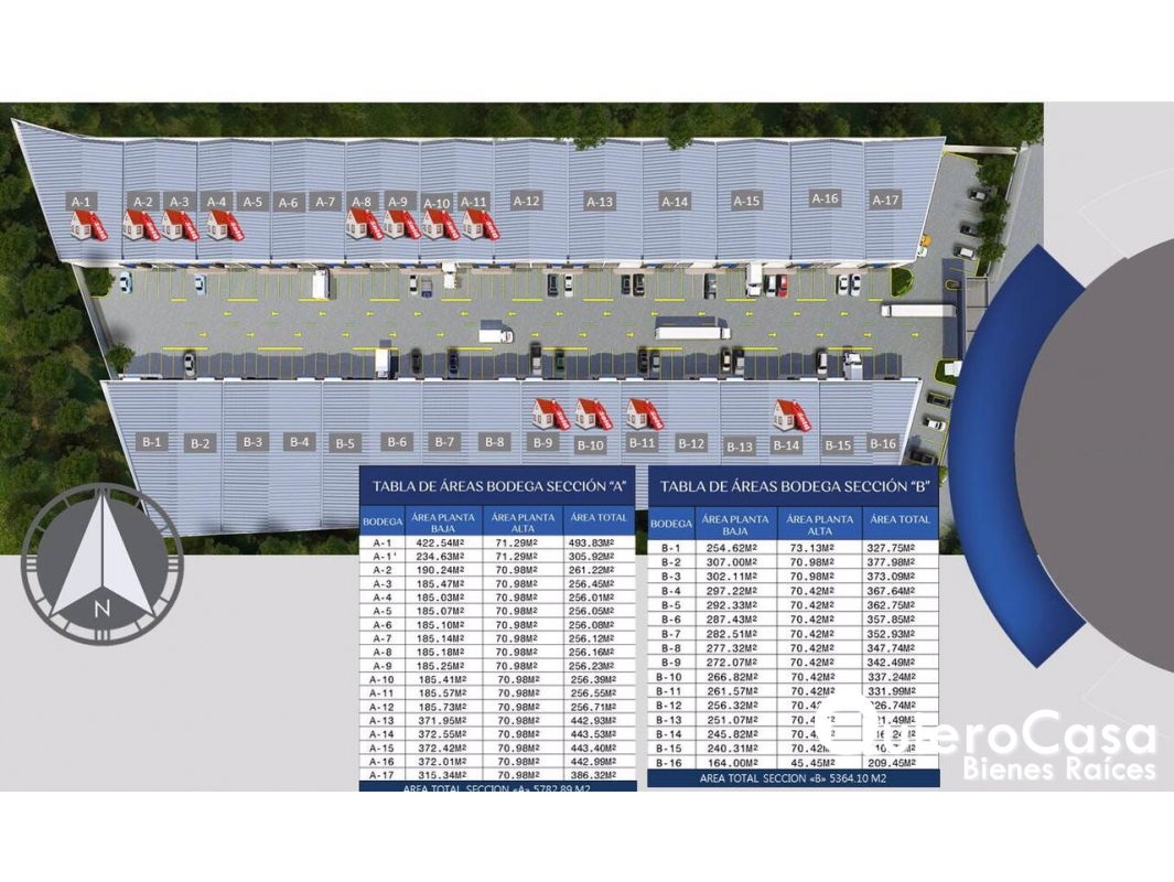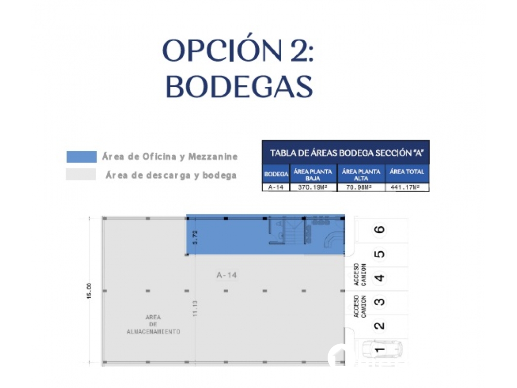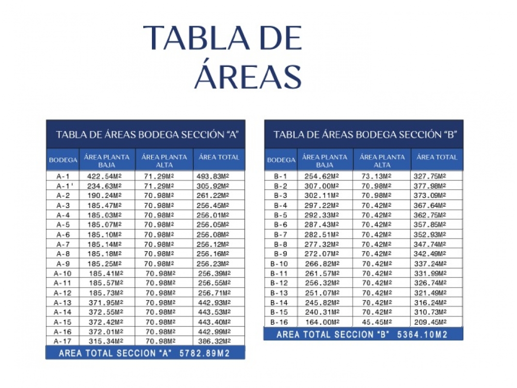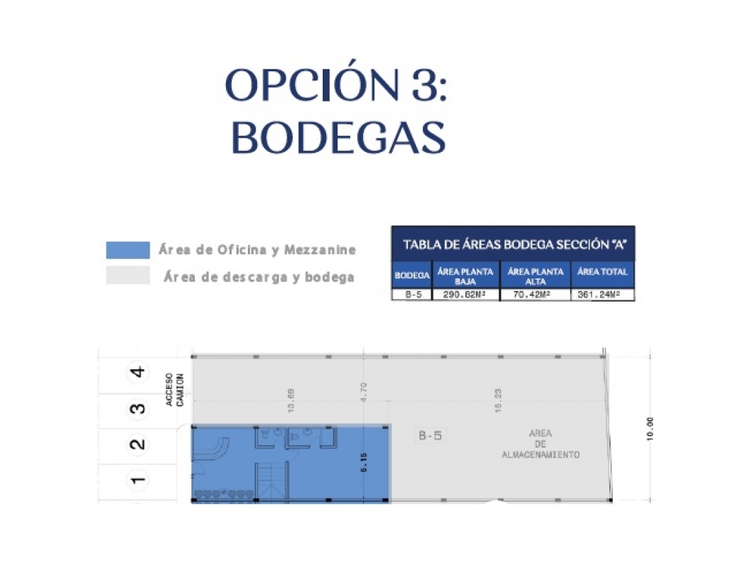 Las Ofi-bodegas cuentan con un área de ventas y exhibición de productos, mezzanine para oficinas; cada una cuenta con un área útil entre 250 y 500 Mts2; Cuentan con andén para carga y descarga, portón de acceso al área de bodega y parqueos de carga para uso común.