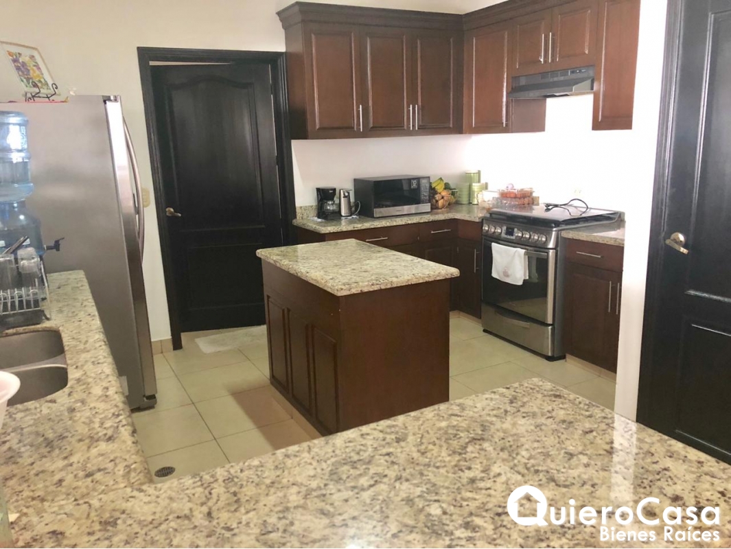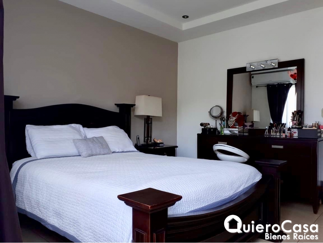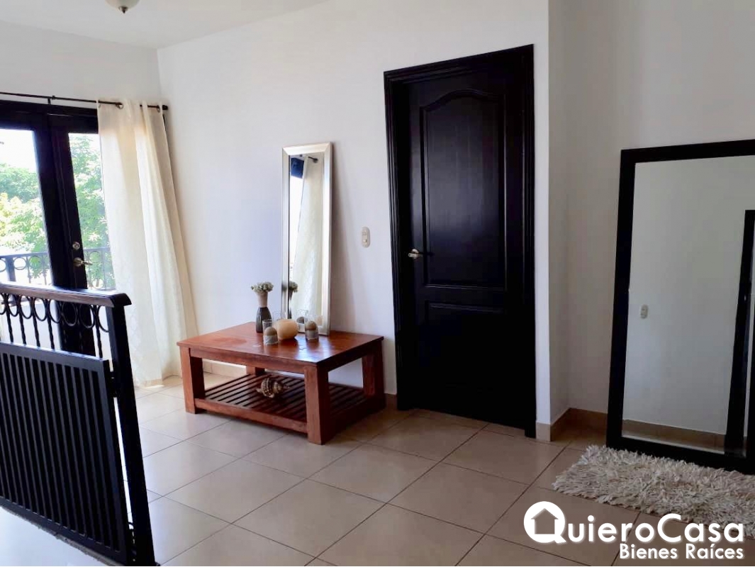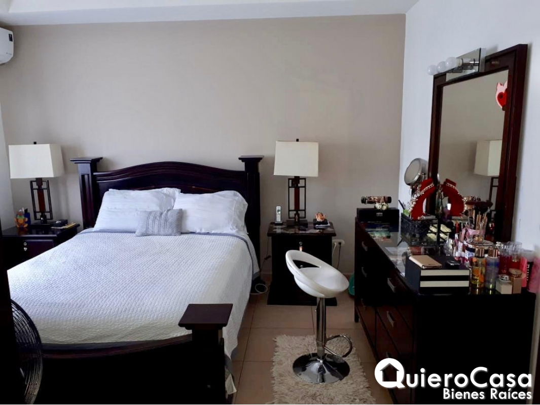 Cuenta con cochera bajo techo para dos vehículos, agua caliente y bomba de agua.. Esta propiedad tiene las siguientes características: Sala, Comedor, Cocina, Área para Desayunador, Walk in Closet, Depósito, Habitación de Servicio con su Baño, Aire Acondicionado, Agua Caliente, Tanque de Agua, Patio, En Condominio, Cerca de Escuela, Cerca de Hospitales, Seguridad 24 Horas, Calle Sin Salida.