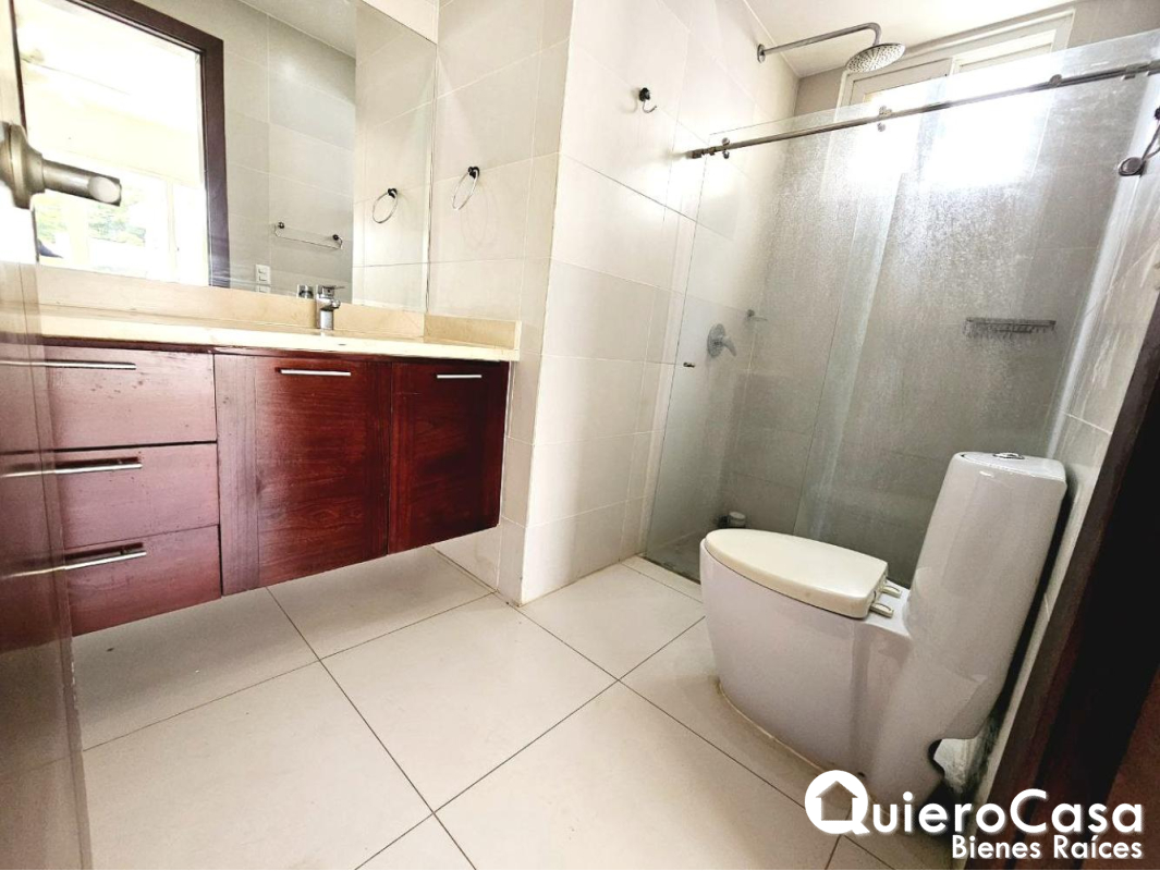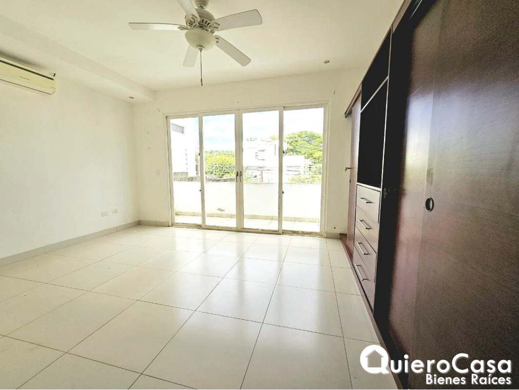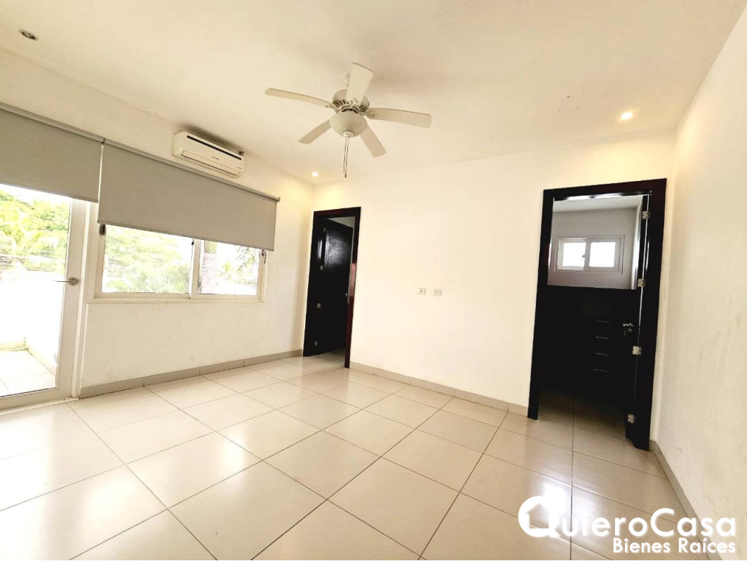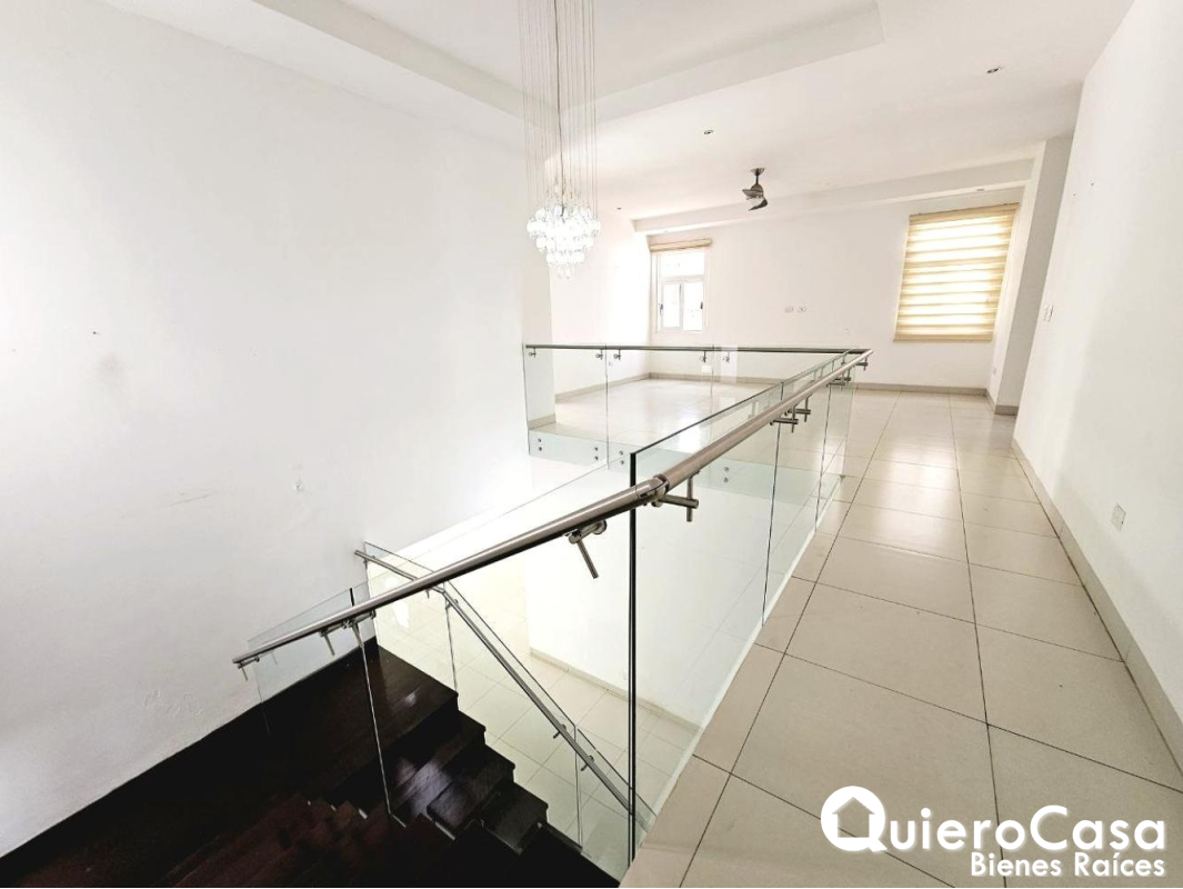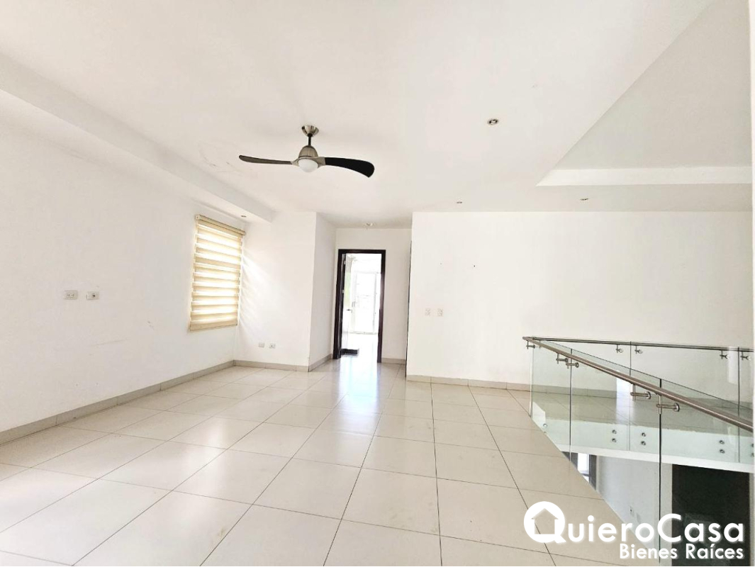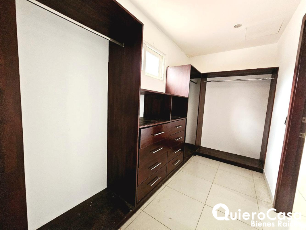 Planta Alta: Escalera de acceso, sala Familiar, habitación principal con baño de lujo, amplio walking closet y terraza, habitación de niño 1 con su walking closet, su baño y balcón, habitación de niño con su walking closet, su baños y balcón.. Esta propiedad tiene las siguientes características: Sala, Comedor, Cocina, Área para Desayunador, Walk in Closet, Depósito, Habitación de Servicio con su Baño, Garaje de Techado, Aire Acondicionado, Agua Caliente, Tanque de Agua, Área de Barbacoa, Cerca de Escuela, Cerca de Hospitales, Seguridad 24 Horas.