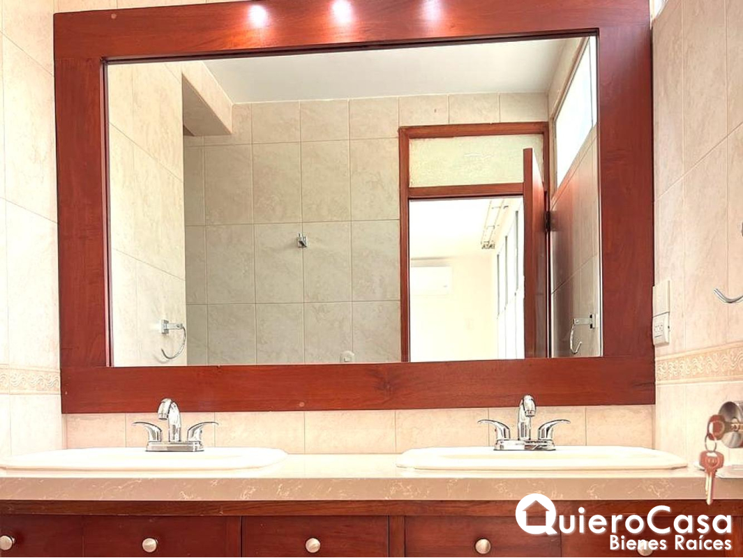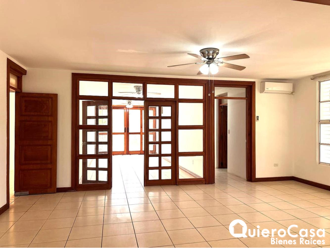 La propiedad cuenta con: Sala, comedor, oficina con baño propio y aire acondicionado, habitación principal con baño privado, dos habitaciones secundarias con baño compartido. Todas las habitaciones con aire acondicionado, Terraza, habitación de servicio, alacena, amplio jardín y estacionamiento para 4 vehículos.