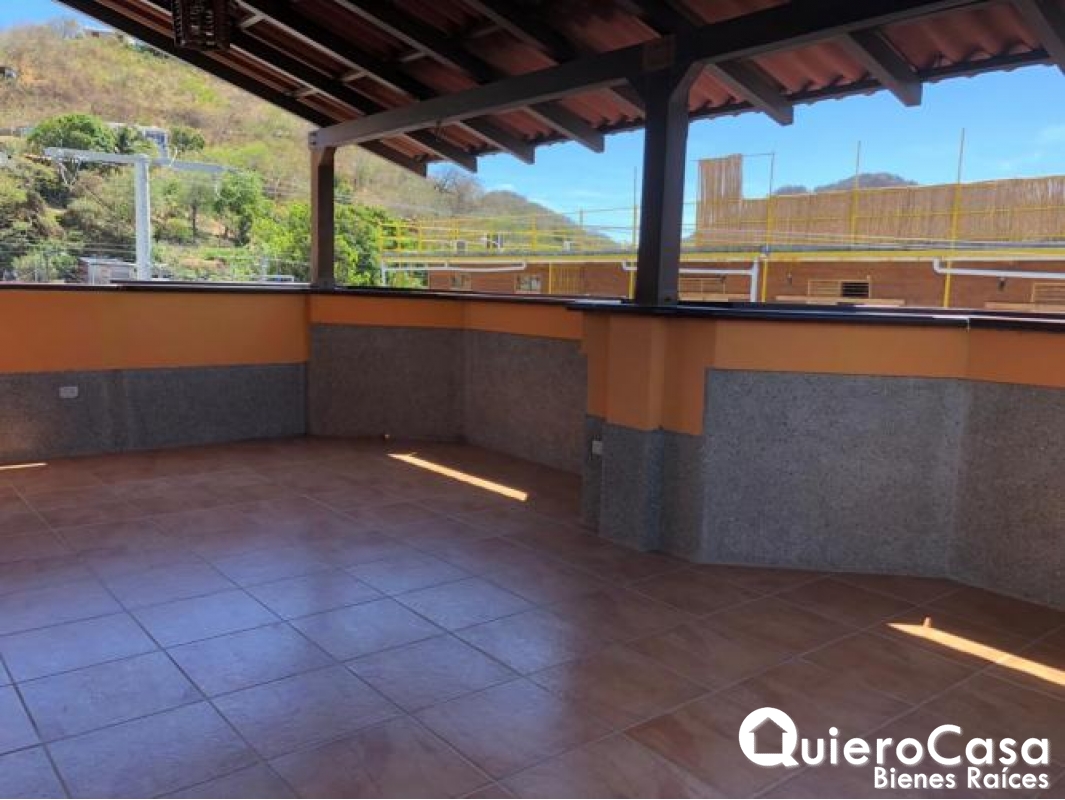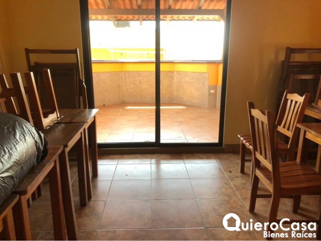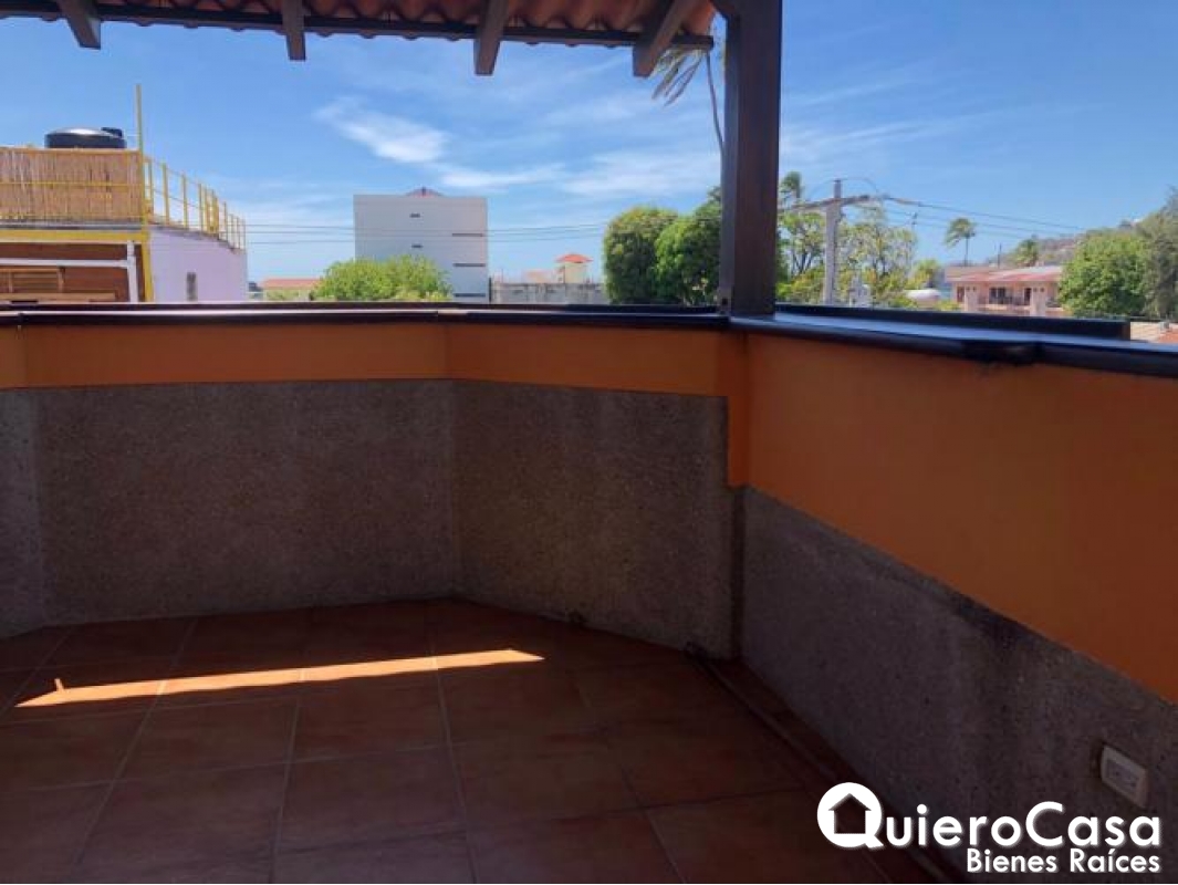 Tercer piso: una habitación con AA donde caben una cama queen y una cama individual. Área común con baño completo y urinario, en el diseño original, esta era una habitación privada hacia la terraza. Terraza