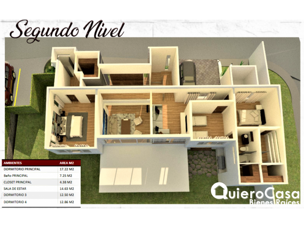 4 habitaciones , tres de ellas en un segundo piso y una en el primer piso.