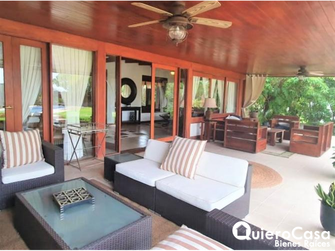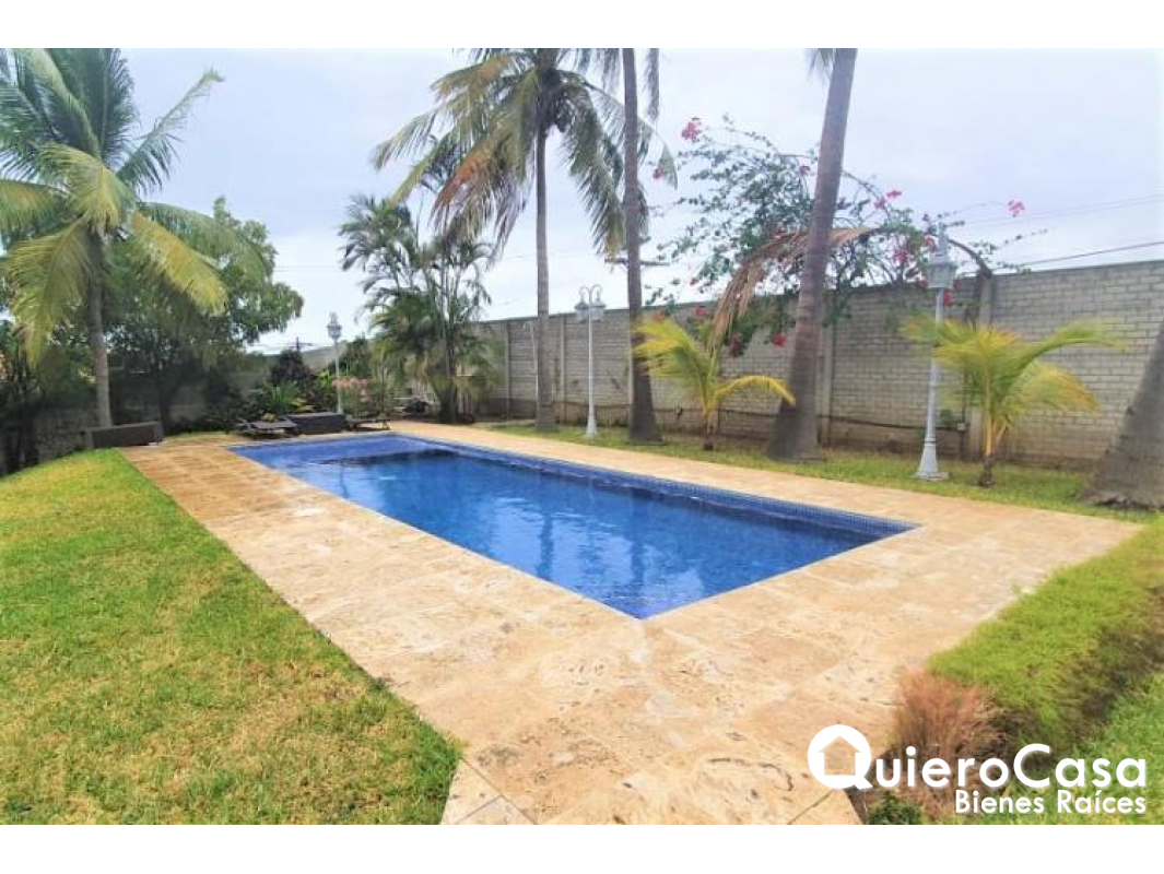 sala, comedor, cocina con top de granito, sala familiar, sala de star, estudio, terraza techada y abierta, 2 bodegas, lavandora, secadora, tanque de agua, calentador de agua, piscina, muros perimetrales.