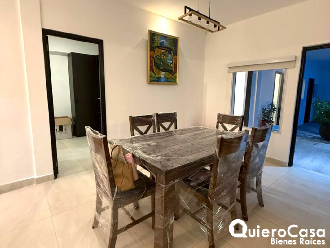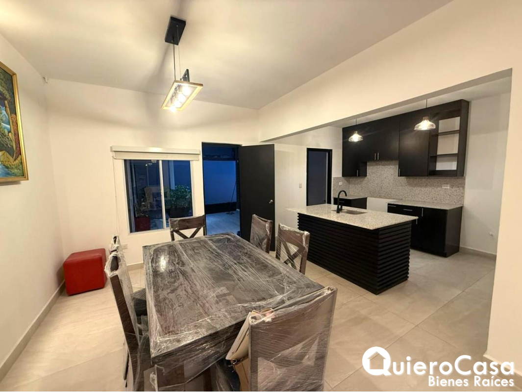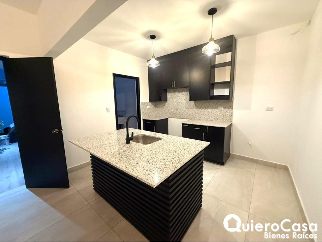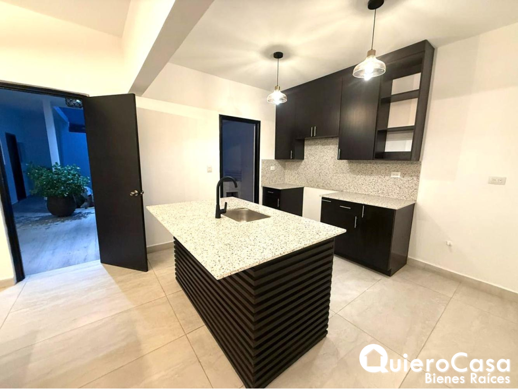 - Cocina moderna: Equipada con una hermosa isla central, top de cuarzo y muebles de madera sólida