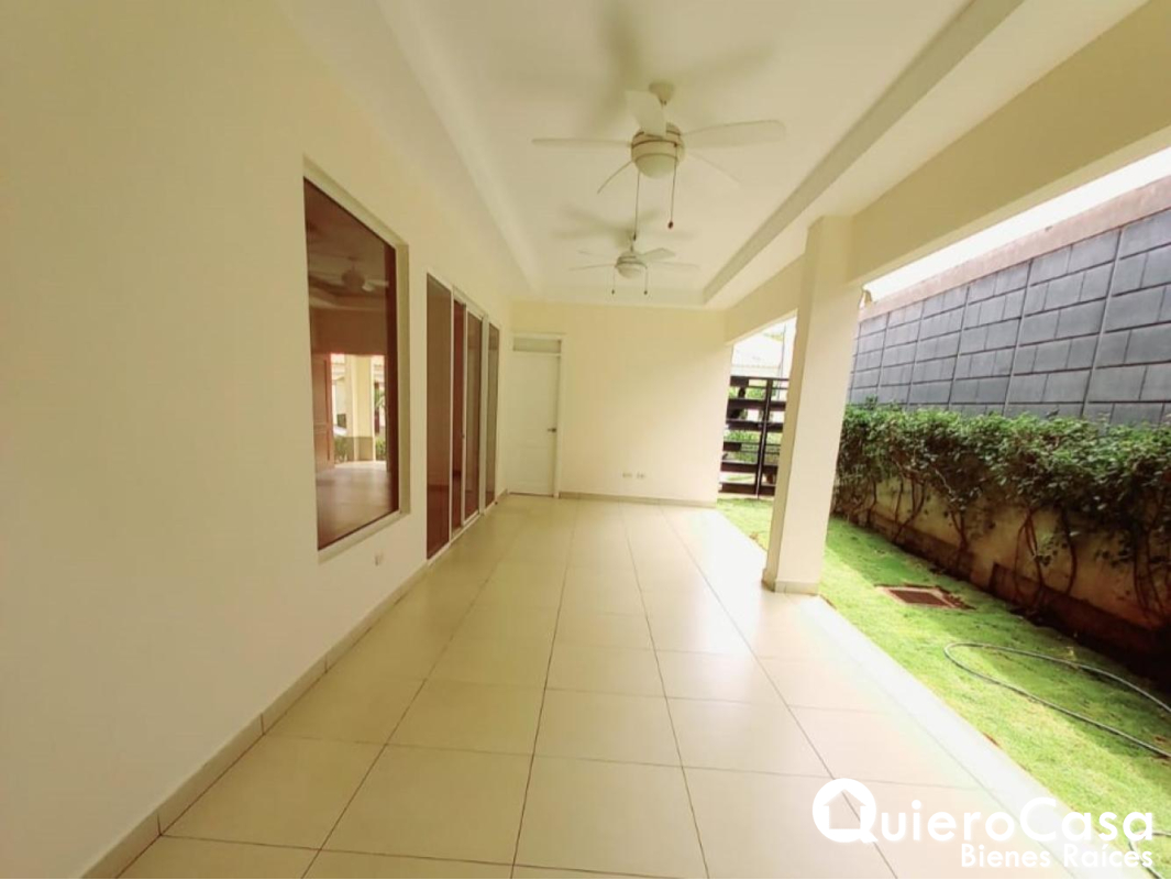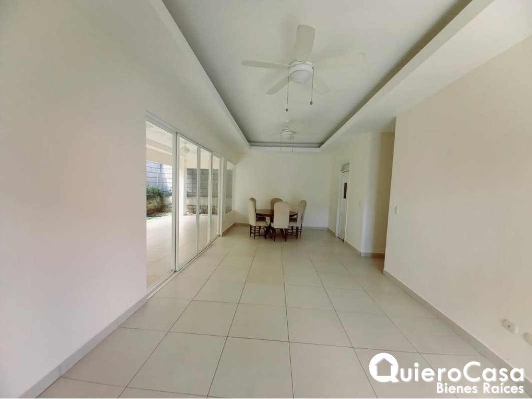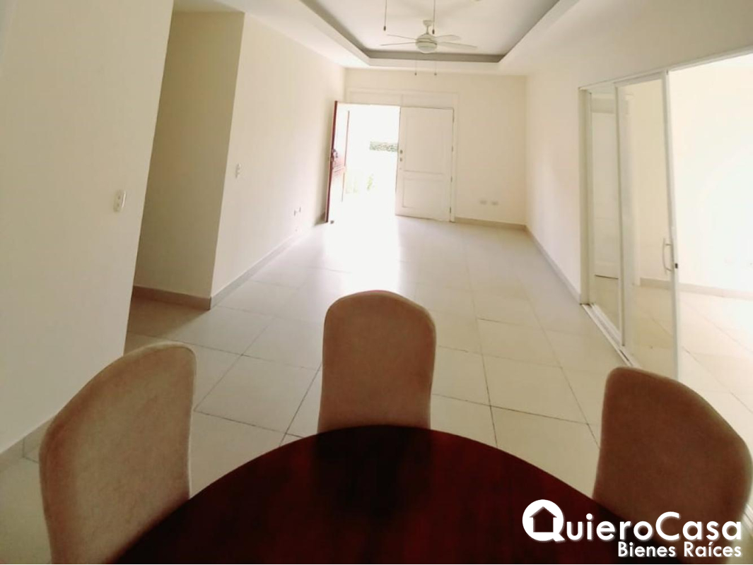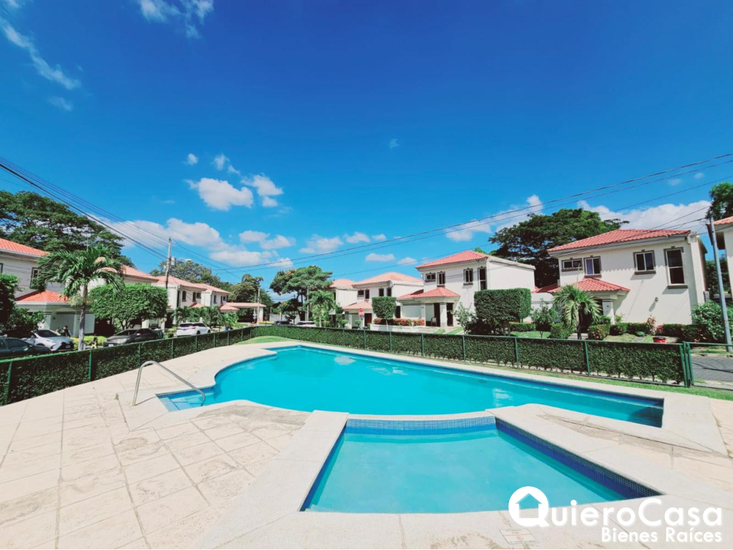 2Hermosa casa de una planta en renta dentro de condominio seguro, centrico y silenicioso de facil acceso cerca de supermercados, escuelas, hospitales, bancos y estaciones de servicio. La casa posee terraza ampliada con baño de visita, habitación principal ampliada, 2 habitaciones secundarias con baño compartido, todas las habitaciones poseen aire acondicionado.. Esta propiedad tiene las siguientes características: Sala, Comedor, Cocina, Aire Acondicionado, Área Social, Piscina Comunal.