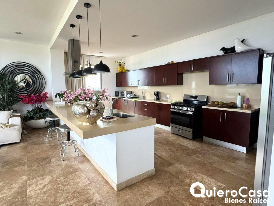Cuenta con una acogedora sala y comedor con grandes ventanales que permiten disfrutar de una bella vista panorámica de la ciudad, creando un ambiente perfecto para compartir momentos en familia o recibir visitas. La cocina es amplia y funcional, equipada con línea blanca y complementada con alacena, brindando mayor espacio para organización y almacenamiento.