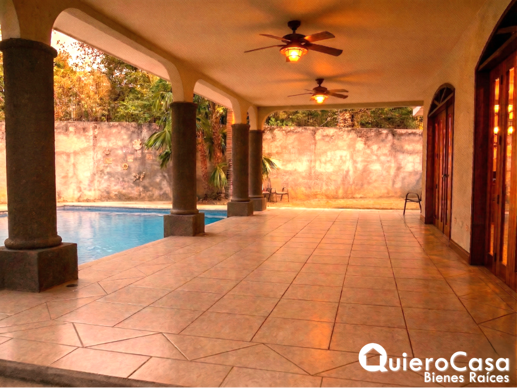 En el área exterior, la propiedad destaca por su amplia terraza, perfecta para reuniones familiares o sociales, y una hermosa piscina, ideal para disfrutar en un ambiente privado.